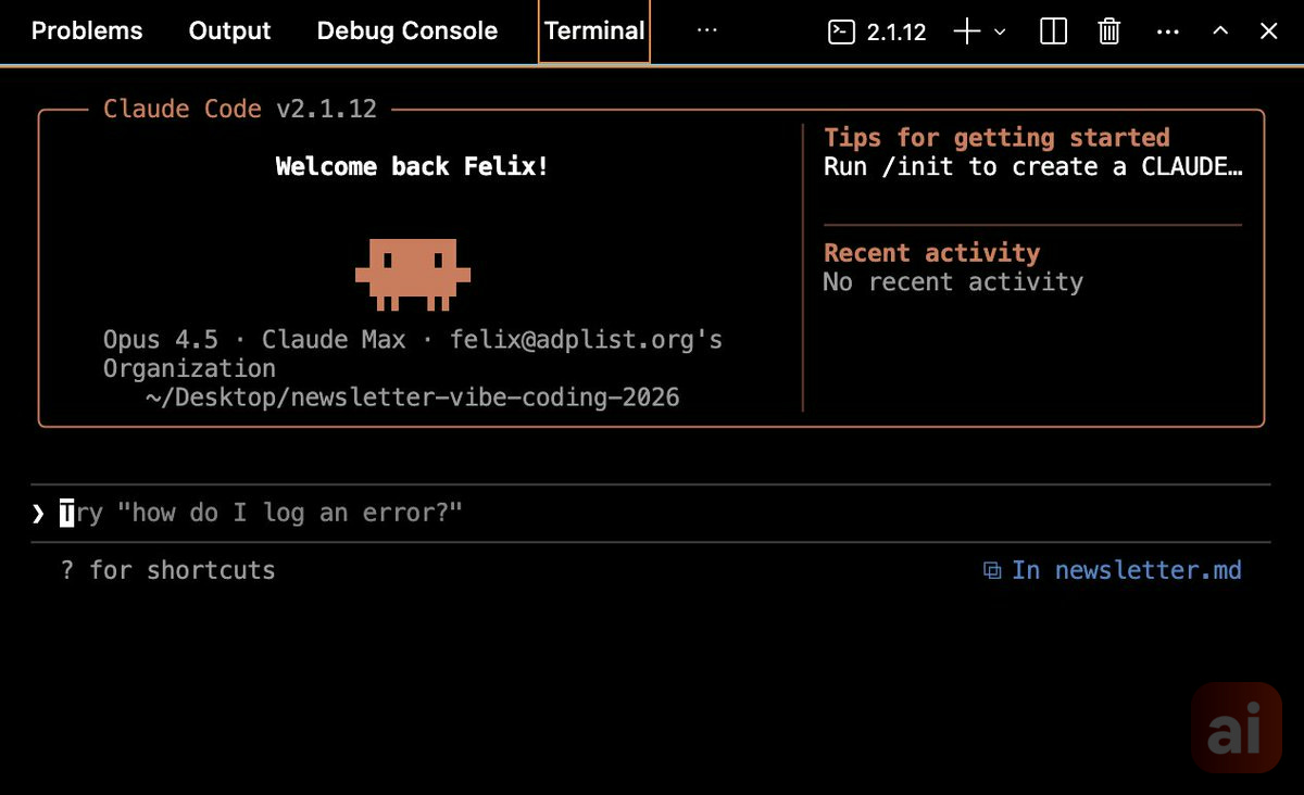 Open the terminal inside Cursor and start Claude Code: